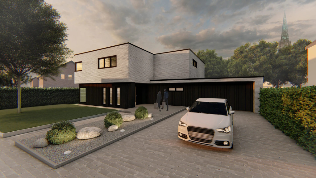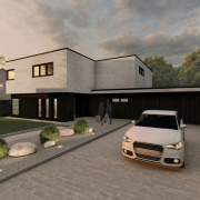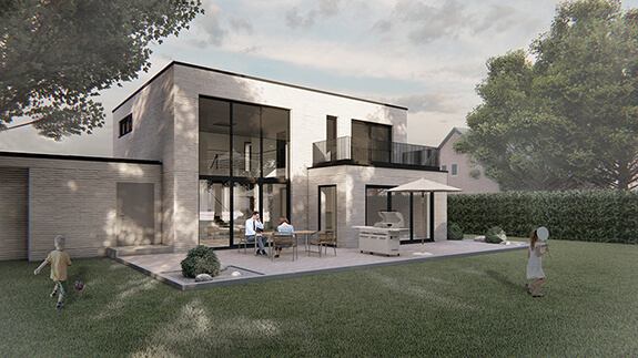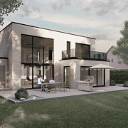 Unsere Planung für den Neubau eines Einfamilienhauses im Heinsberger Raum. Mit 7 Zimmern und 230m² Wohnfläche orientiert sich der Grundriss zum großzügigen Garten. Der offen gehaltene Wohnbereich teilt sich räumlich durch Niveauunterschiede. Eine lichtdurchflutete Galerie im Obergeschoss lässt dieses Geschoss am Leben im Wohngeschoss teilhaben. Die Fassade besticht durch klare Linien und natürlichen Materialien.