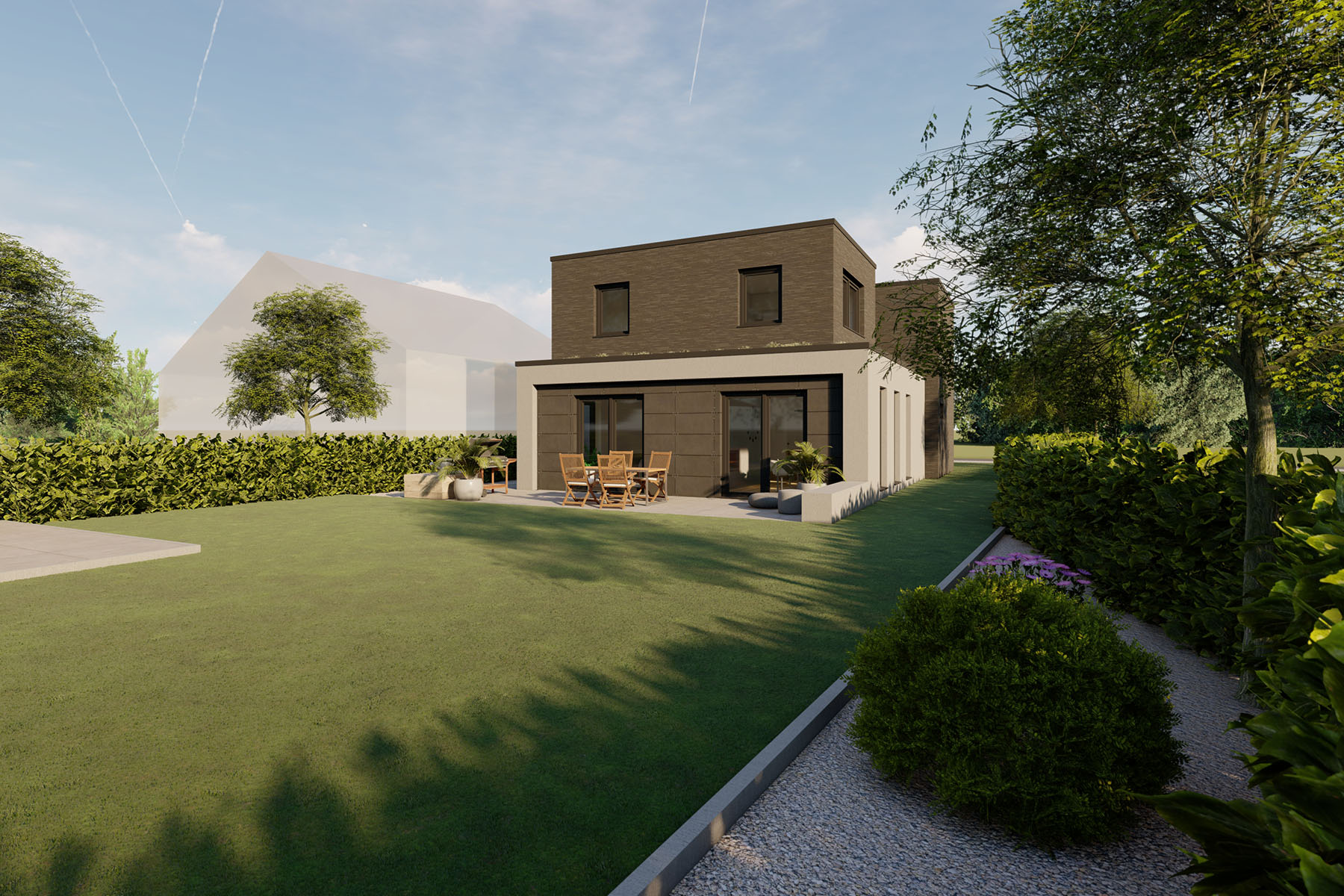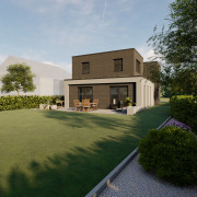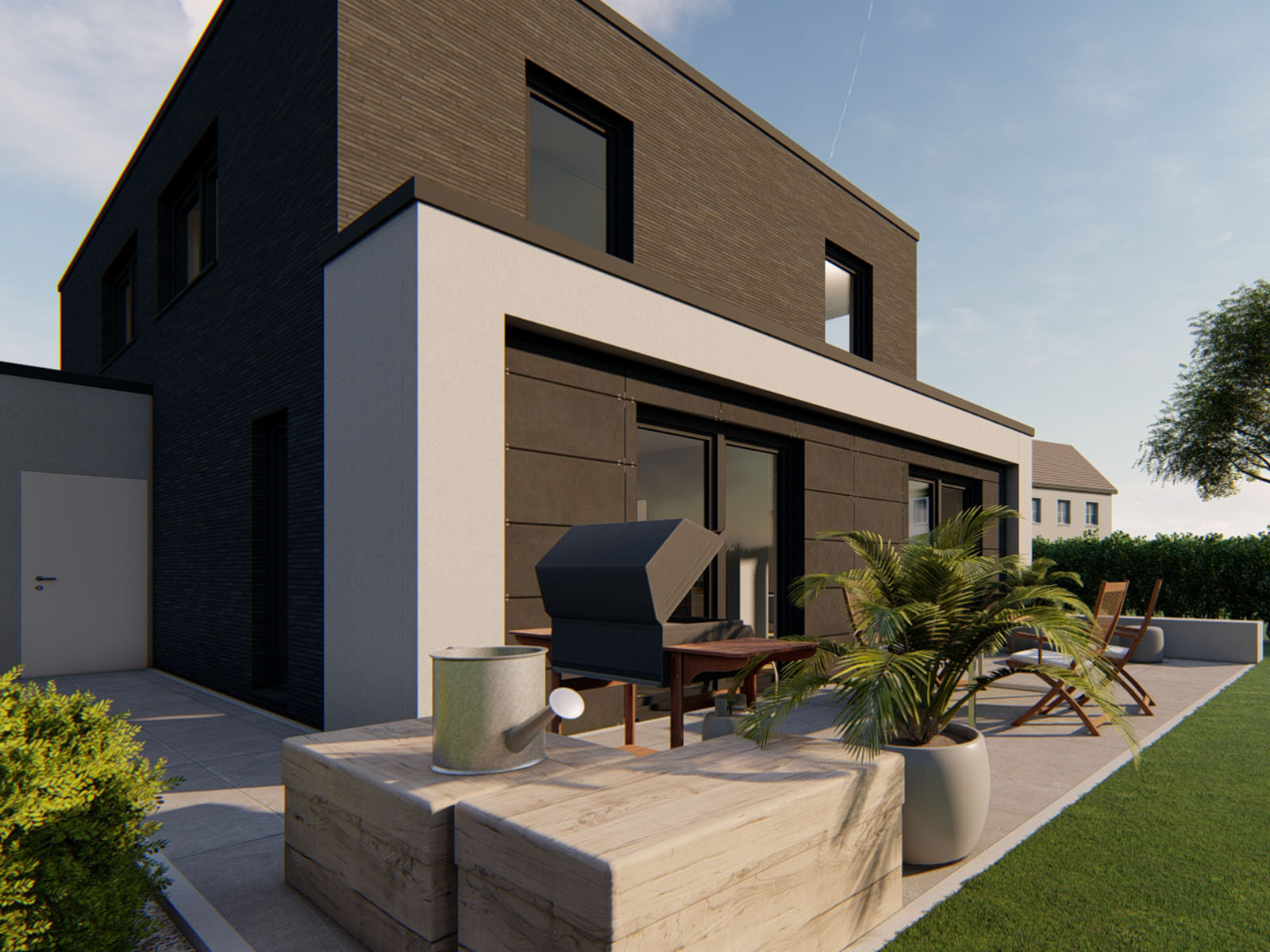 Das Haus H besticht durch seine klare Formsprache. Die kubistische Form des Haupthauses wird durch den vorgelagerten Rahmen aufgelockert. Gleichsam inszeniert dieser, als formgebendes Element, die großzügige Doppelgarage. Der sanft gewählte Material- und Farbmix zwischen anthrazitfarbenen Klinker und Sichtbetonspachtel im Rahmen, ergeben durch gleiche Farbfamilien eine perfekte Symbiose.