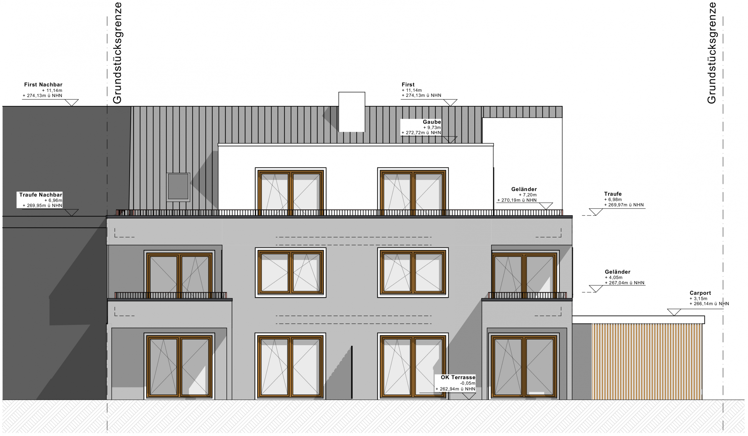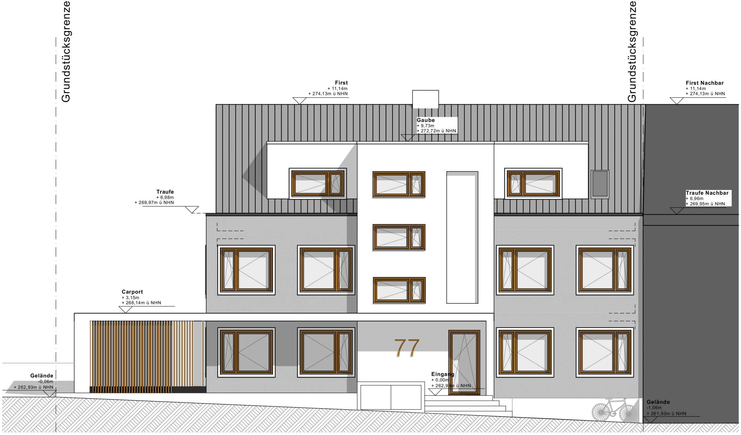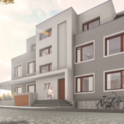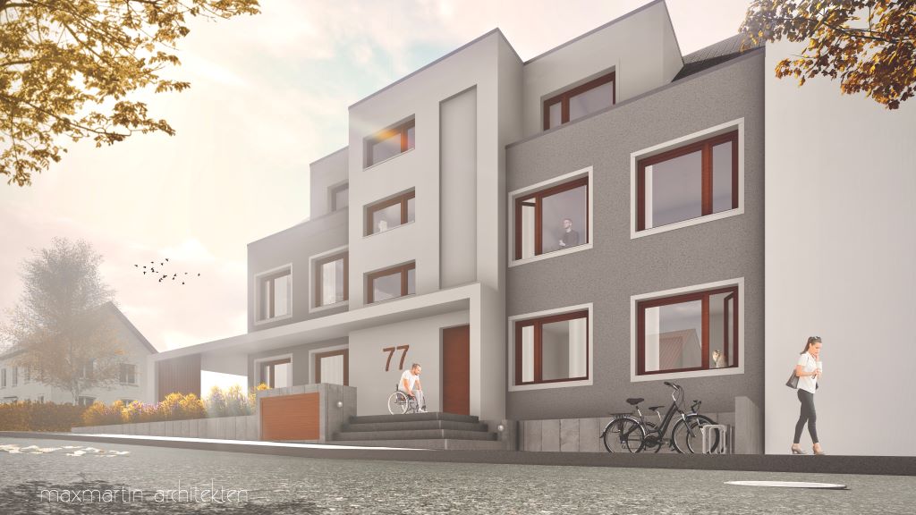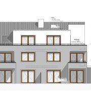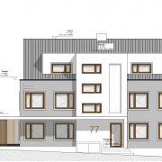 Unsere Planung zu einem barrierefreien Mehrfamilienhaus. Das Treppenhaus soll abgesetzt werden, zudem geht eine rahmende Eingangsüberdachung in ein Carport über. Dieses bietet Platz für 5 PKW’s. Die sich wiederholenden Holzelemente in den asymetrischen Fenstern und in der Fassadenbekleidung vervollständigen die Materialwahl. Das Gebäude beherbergt fünf Wohneinheiten auf drei Geschossen. Herzstück des Objektes ist das Penthouse im Dachgeschoss mit seiner 40 Quadratmeter großen Dachterrasse.