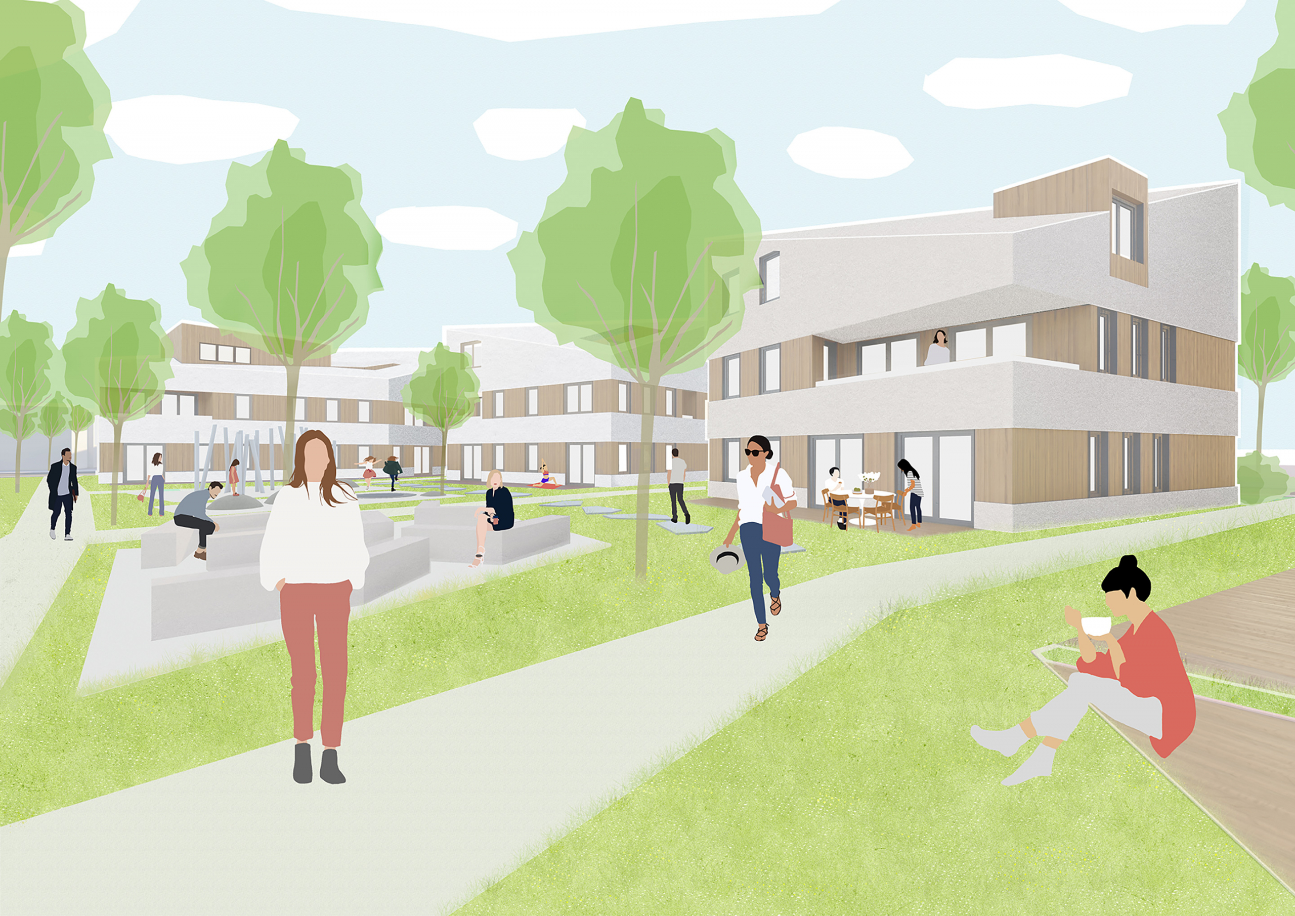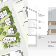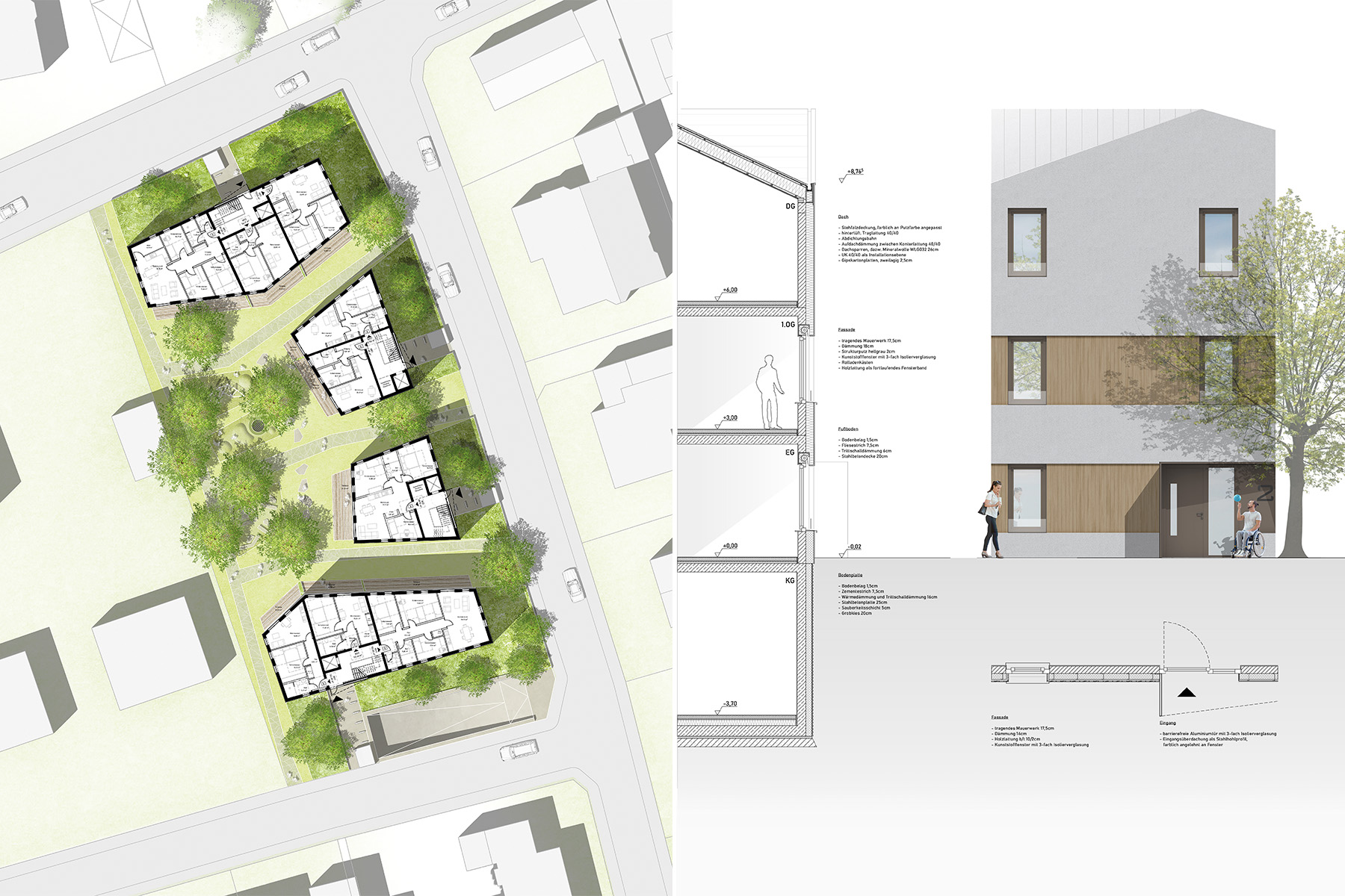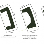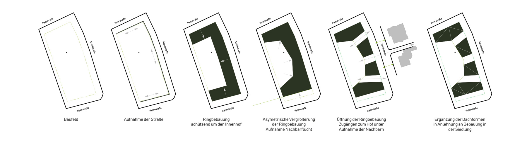 Die Gemeinde Schwaig beabsichtigt, an dem Standort an der Parkstraße 13 / Heimstraße 2 in Schwaig geförderte Wohnungen nach dem kommunalen Wohnungsförderprogramm zu errichten. Das architektonische Konzept verfolgt folgende Ziele: Harmonisches Einfügen in den Siedlungscharakter durch Aufnahme der Gebäudegrößen und Dachformen der umliegenden Bebauung. Qualitätvoller & wirtschaftlicher Baustandard durch individuelle Gebäudekubaturen und Materialkombinationen in der Fassade. Angebot einer Nachbarschaftsbildung durch die Herstellung eines offenen Innenhofs.